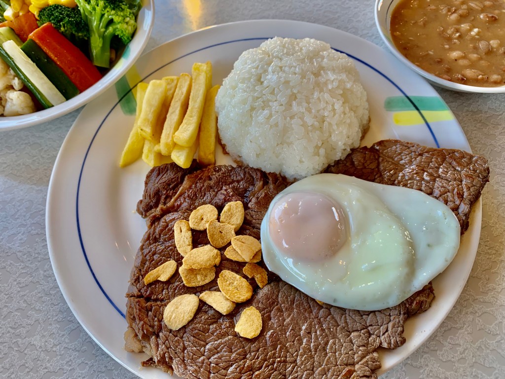 牛ステーキ200gに目玉焼きとポテトを添えて。